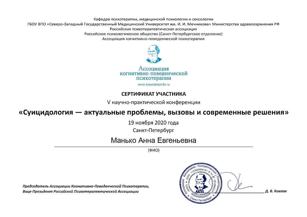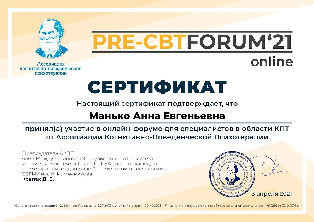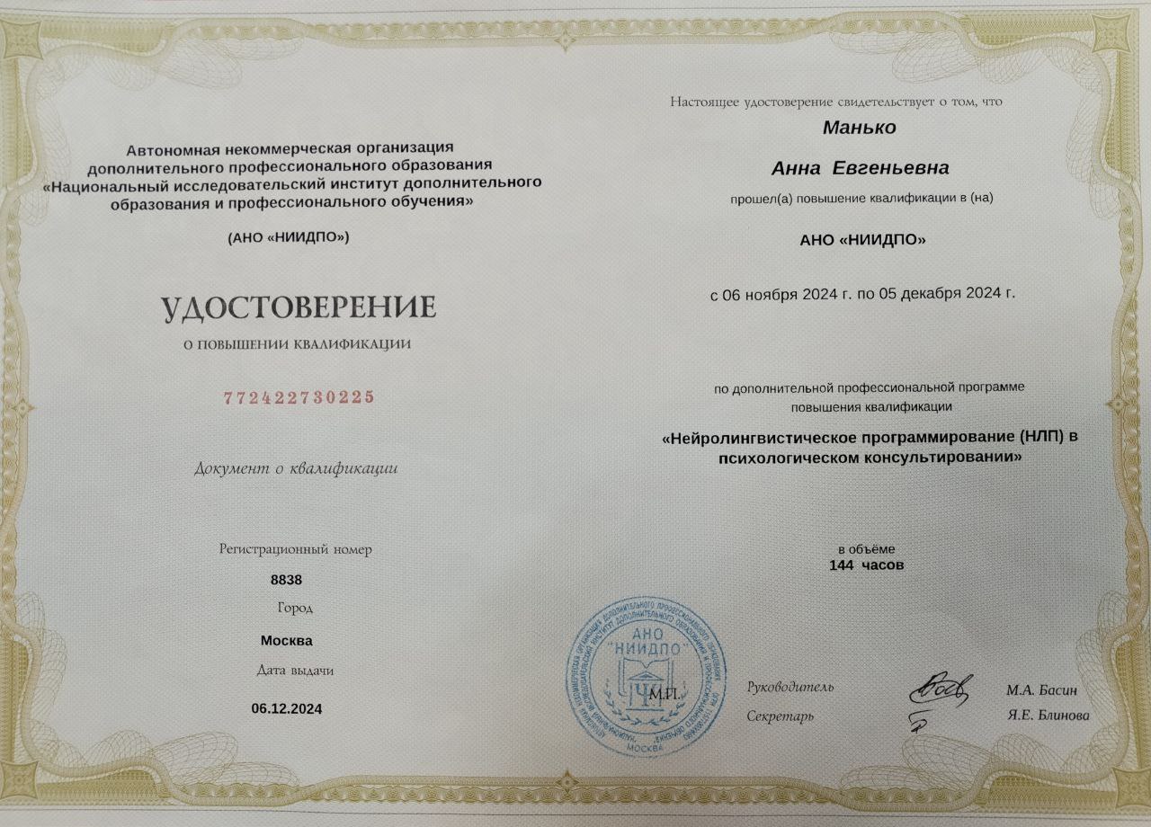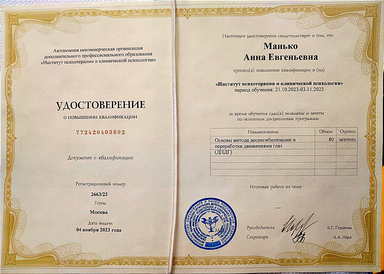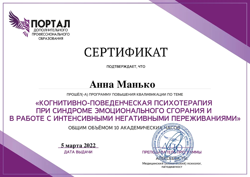 Я профессиональный психолог и моя цель - помочь Вам в кризисах, сложных жизненных ситуациях, ситуациях неопределенности и неустойчивости психоэмоциональных состояний.